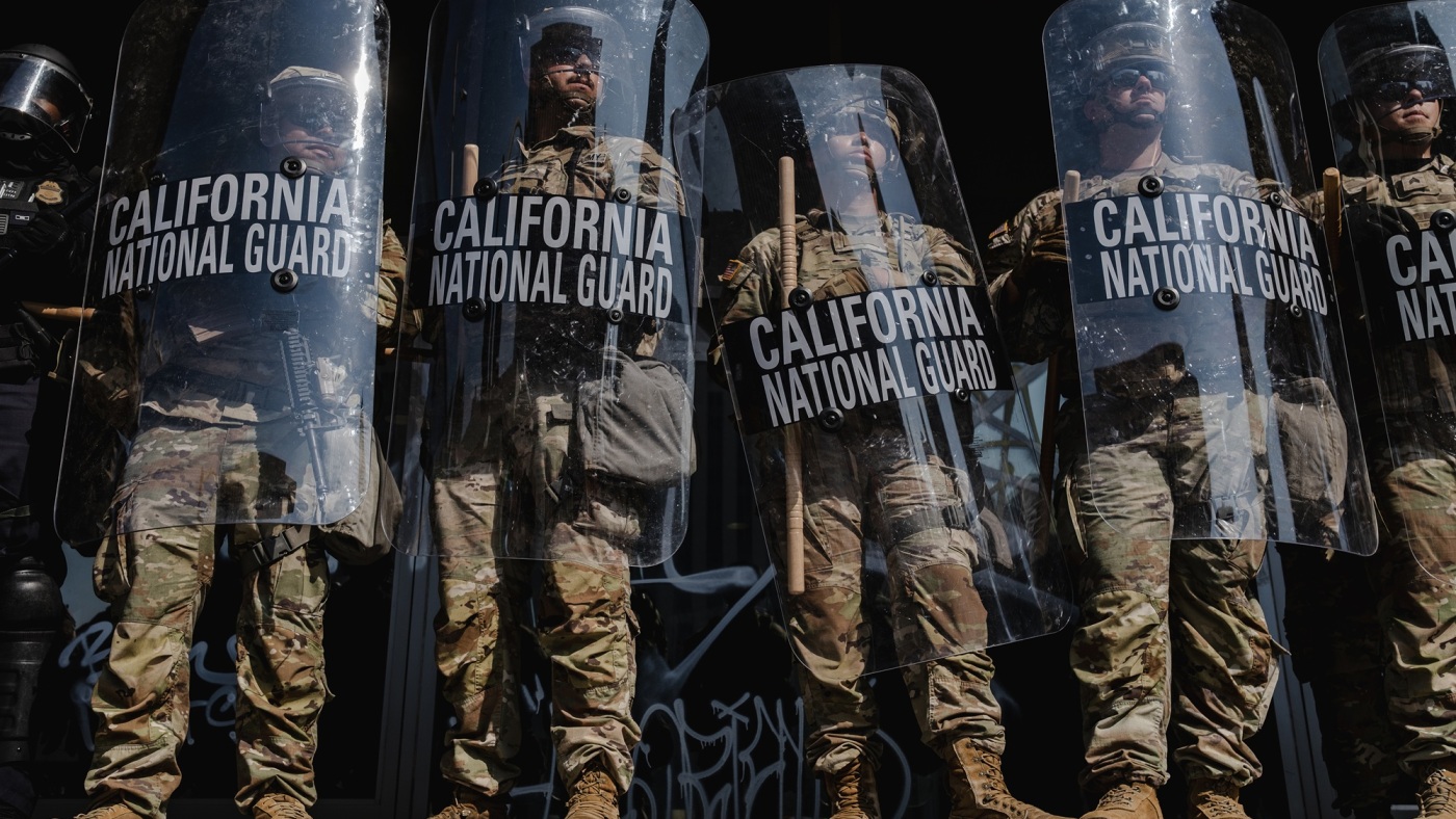 Miembros de la Guardia Nacional se encuentran afuera del Edificio Federal Edward Roybal el 9 de junio de 2025 en el centro de Los Ángeles.