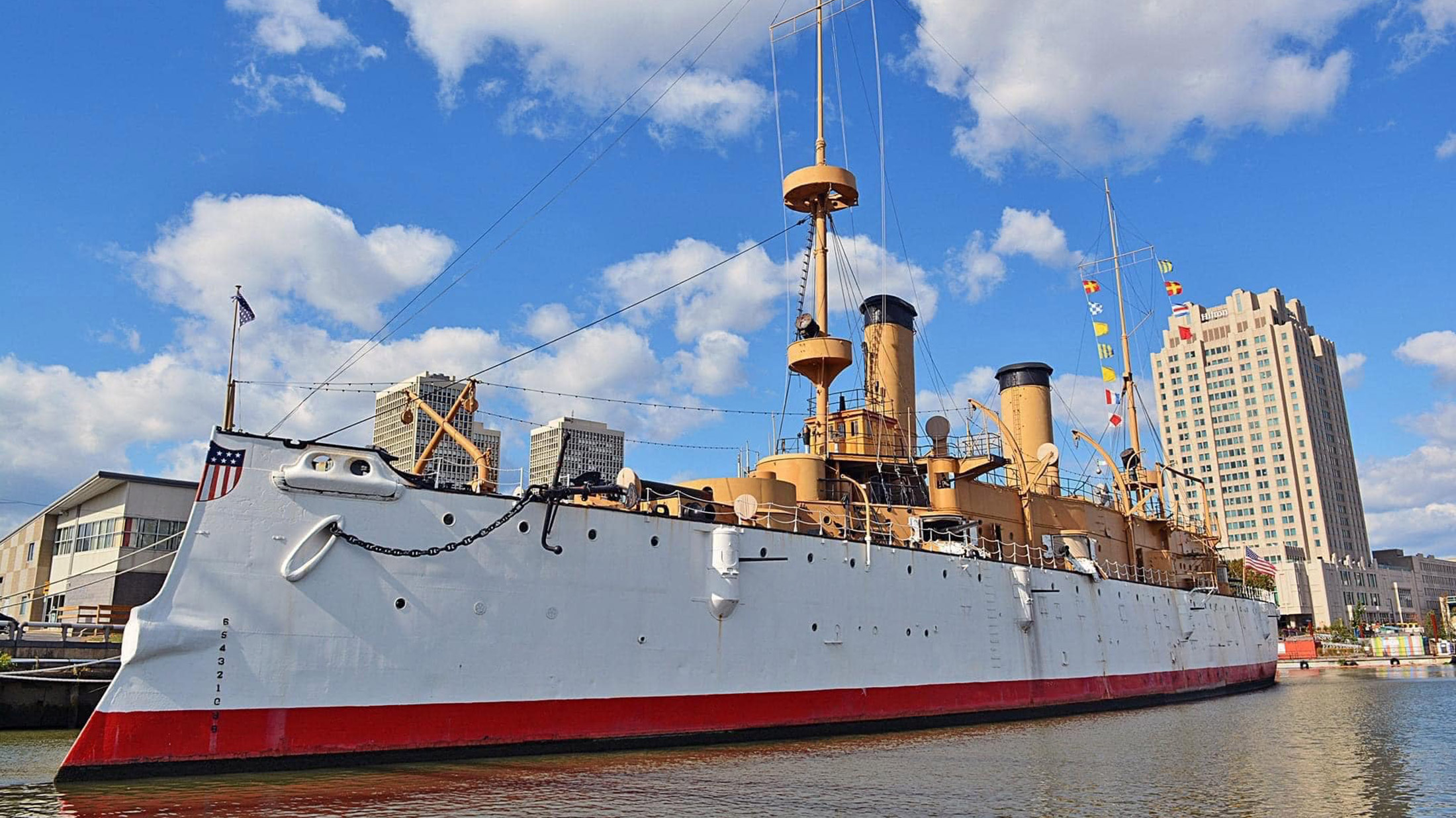 Vista aérea del USS Cruiser Olympia, flotando en el río Delaware con el horizonte de Filadelfia y la hilera de árboles en el fondo
