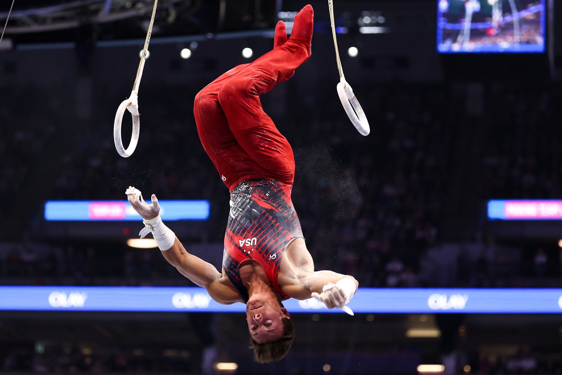 Gimnasia: Pruebas por equipos olímpicos de EE. UU. para 2024 - Gimnasia29 de junio de 2024; Minneapolis, Minnesota, EE. UU.; Brody Malone compite en anillas durante las pruebas de gimnasia por equipos olímpicos de EE. UU. en el Target Center. Crédito obligatorio: Matt Krohn-USA TODAY Sports