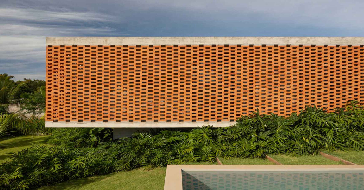 La fachada de ladrillo perforada puntúa la casa de concreto de Fernanda Padula en Brasil