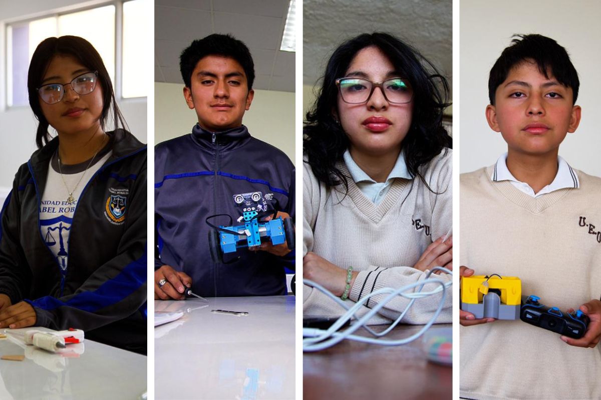 En la Unidad Educativa Uyumbichoen Quito, la docente Alejandra Fonseca coordina dos niveles. Comenzaron con niños de siete y ocho años, que trabajan con estructuras sencillas y material reciclado para comprender principios mecánicos y de diseño. El nivel avanzado, en cambio, profundidad en programación y electrónica, apoyado por estudiantes de la Central que acompañan a los adolescentes en el aprendizaje de conceptos más complejos. Para Fonseca, el propósito es claro: que los alumnos desarrollen pensamiento computacional, pensamiento crítico y habilidades de trabajo en equipo.