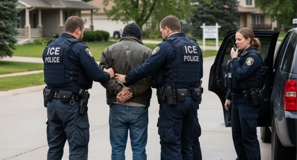Distintos agentes de ICE colocaron al ciudadano mexicano contra el pavimento para colocarle las esposas. (Crédito: Imagen creada por El Comercio MAG usando la IA de «Gemini»)