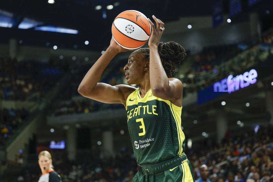 WNBA: Seattle Storm en Chicago Sky24 de julio de 2025; Chicago, Illinois, EE. UU.; El delantero de Seattle Storm Nneka Ogwumike (3) busca pasar el balón contra el cielo de Chicago durante la segunda mitad en Wintrust Arena. Crédito obligatorio: Kamil Krzaczynski-Imagn Imágenes