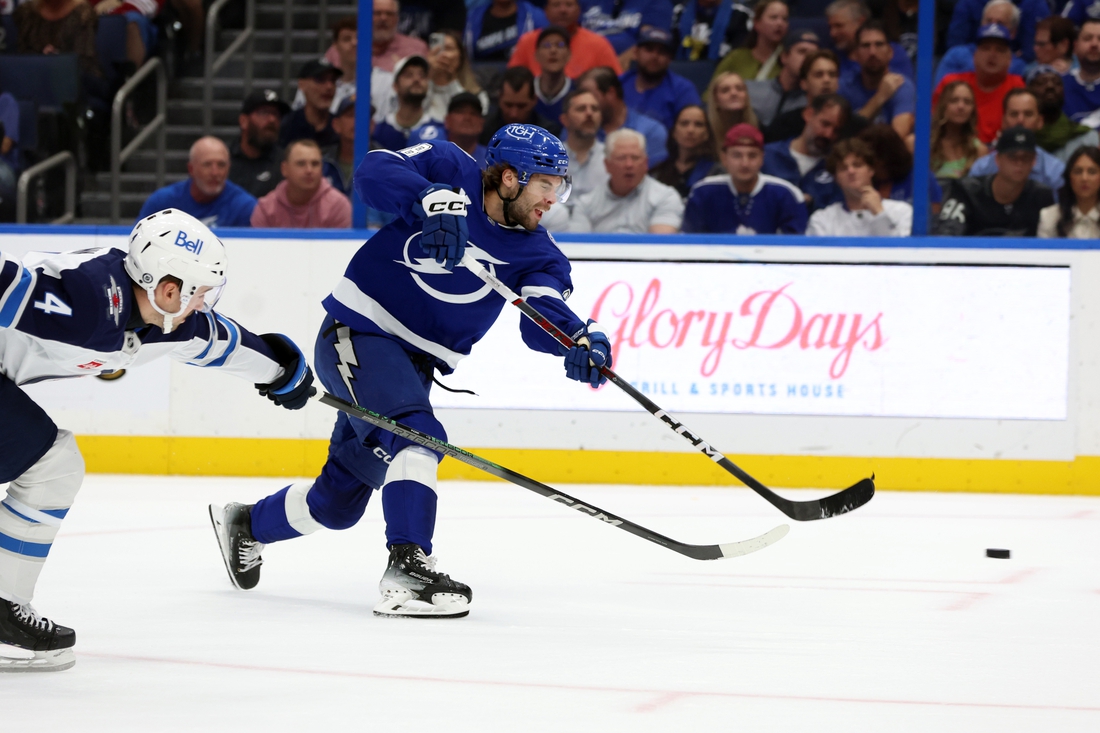 14 de noviembre de 2024; Tampa, Florida, Estados Unidos; El ala izquierda de Tampa Bay Lightning Brandon Hagel (38) dispara mientras el defensor de Winnipeg Jets Neal Pionk (4) defiende durante el primer período en Amalie Arena. Crédito obligatorio: Kim Klement Neitzel-Imagn Images Los Tampa Bay Lightning de repente encontraron su encanto el lunes por la noche contra los Colorado Avalanche y buscarán mantener la ofensiva prosperando cuando reciban a los Washington Capitals el miércoles por la noche.