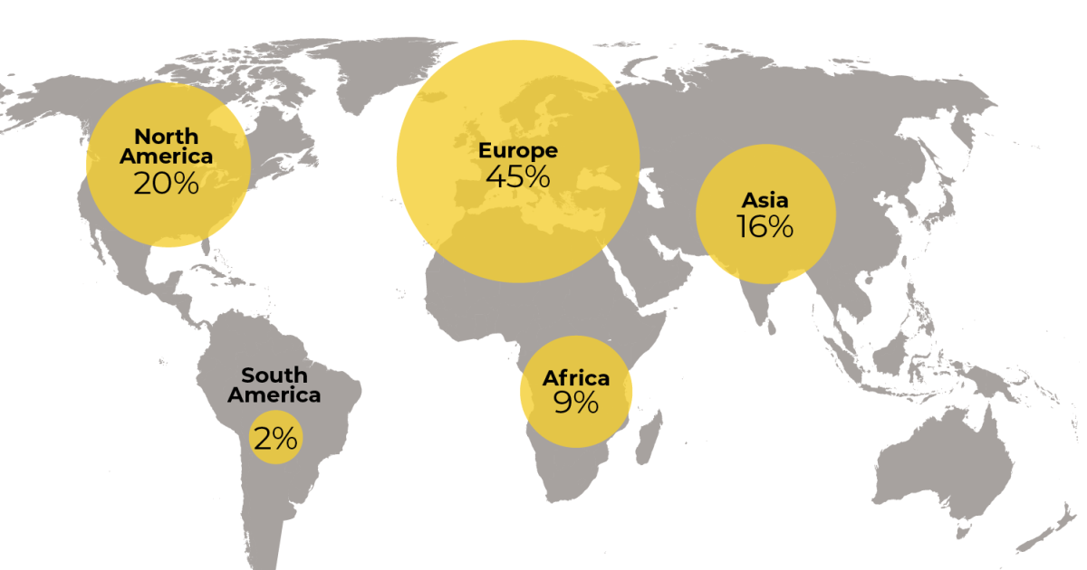 Geográficamente, Europa representa la mayor proporción de galardonados con un 45 por ciento, seguida de América del Norte (20 por ciento), Asia (16 por ciento), África (9 por ciento) y América del Sur (3 por ciento).