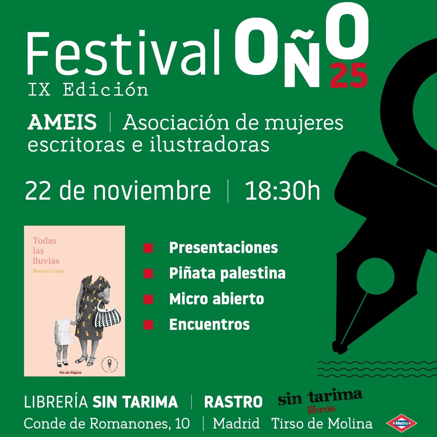 El próximo sábado, 22 de noviembre, a las 18:30hse celebrará la IX edición del Festival OÑOorganizado por la Asociación de Mujeres Escritoras e Ilustradoras (AMEIS)en la Librería Sin Tarima (Rastro)situada en Conde de Romanones, 10 (Metro Tirso de Molina).