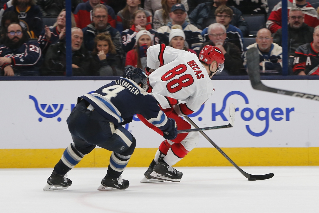 31 de diciembre de 2024; Columbus, Ohio, Estados Unidos; El centro de Carolina Hurricanes, Martin Necas (88), patina alrededor del control del centro de Columbus Blue Jackets, Cole Sillinger (4) durante horas extras en Nationwide Arena. Crédito obligatorio: Russell LaBounty-Imagn Images Hubo momentos en que los huracanes de Carolina parecieron un poco desequilibrados durante el mes pasado, pero es posible que estén recuperando su ritmo nuevamente.