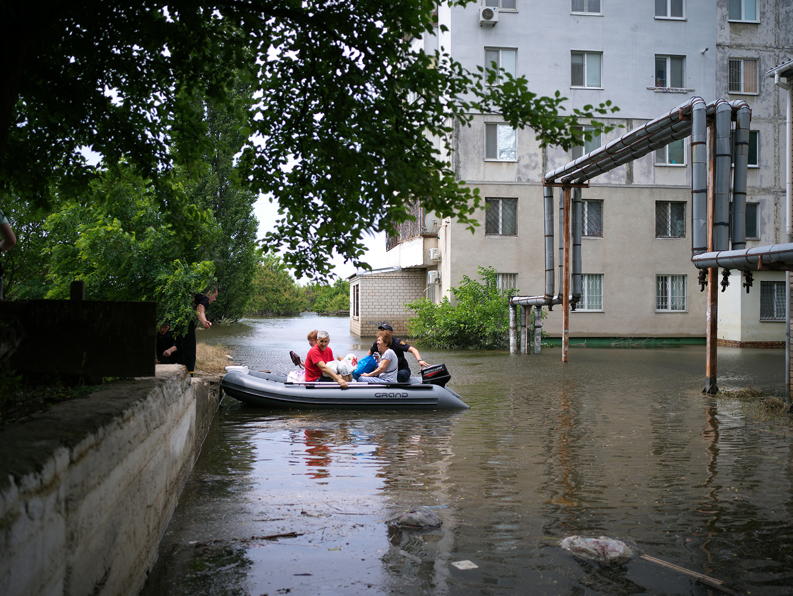 La destrucción de la presa Nova Kakhovka en la provincia de Jersón el 6 de junio de 2023 provocó inundaciones masivas en la región a ambos lados del río Dniéper. Imagen vía Protección civil y ayuda humanitaria de la UE.