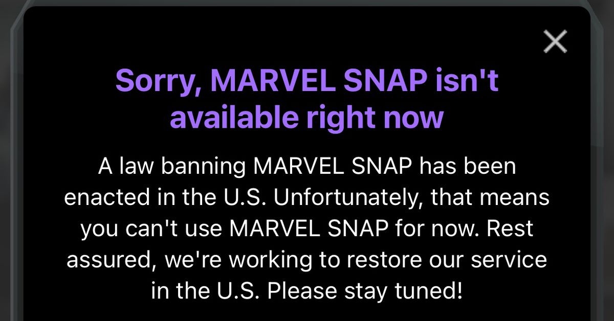 Se ha promulgado una ley que prohíbe Marvel Snap en los EE. UU. Desafortunadamente, eso significa que no puedes usar Marvel Snap por ahora. Tenga la seguridad de que estamos trabajando para restaurar nuestro servicio en los EE. UU. ¡Estén atentos!