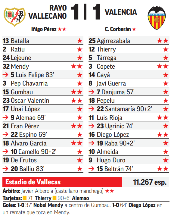 El empate llegó cuando el Valencia estaba a punto de sacar la bandera blanca. La zaga del Rayo no acertó a despejar un centro de Pepelu, la jugada se alargó y el remate final de Diego López lo desvió el propio Nobel Mendy a la red para desesperación de batalla.