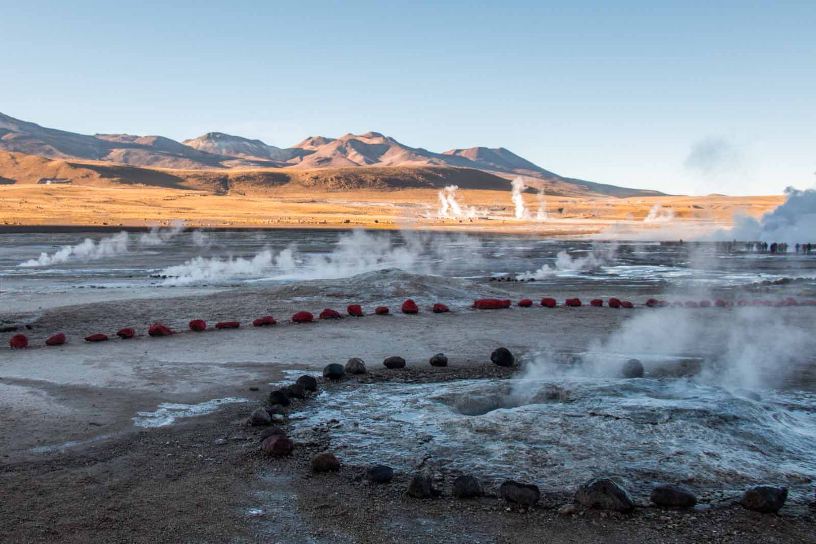 Después de dos horas de viaje, llegamos al campo geotérmico. Caminamos por la reserva, sintiendo su actividad interna. Era una sensación única que combinaba las poderosas vistas de las montañas de los Andes con las aguas termales de las cuales emana el vapor. Entrar en este lugar es como sentir la tierra respirando, sudor, está vivo. La huella del lugar es maravillosamente surrealista. La mezcla de luces y sombras, vapor y sonidos forman un cóctel único para los sentidos.