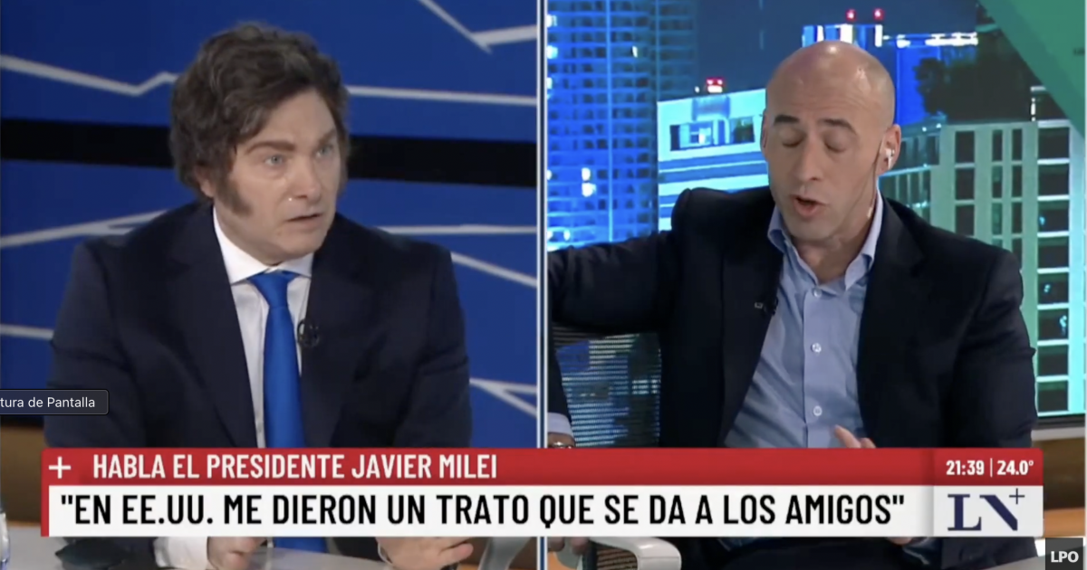 Javier Milei se sacó con su amigo Esteban Trebucq cuando el periodista le preguntó por la frase brutal de Trump en el encuentro de la Casa Blanca. «La malinterperación maliosa de una periodista descontextualizando una definición del presidente Trump para operar en contra del Gobierno porque tienen problemas en su mercado», empezó a engranar Milei.