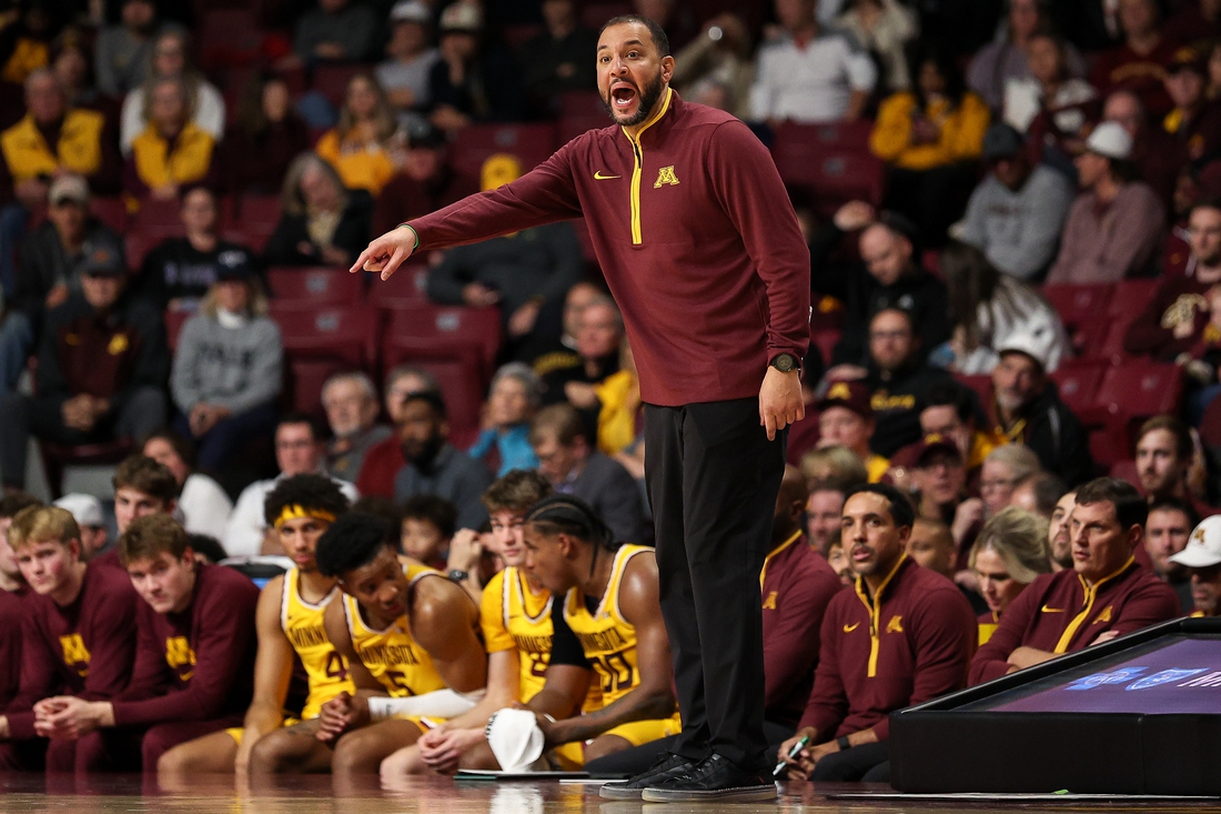 16 de noviembre de 2024; Mineápolis, Minnesota, Estados Unidos; Ben Johnson, entrenador principal de Minnesota Golden Gophers, reacciona durante la segunda mitad contra los Yale Bulldogs en Williams Arena. Crédito obligatorio: Matt Krohn-Imagn Images El entrenador de Minnesota, Ben Johnson, cree que su equipo está en el camino correcto hacia el éxito.