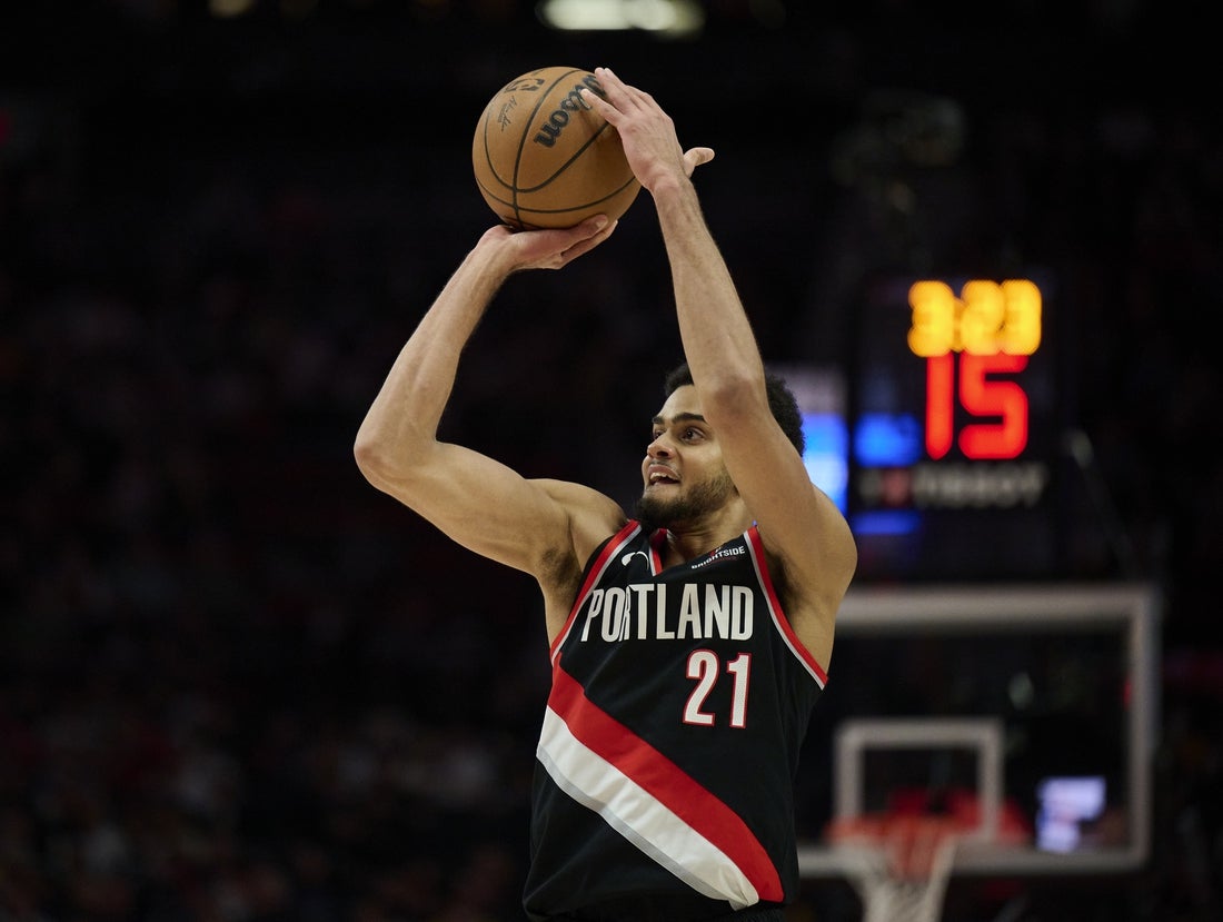 11 de abril de 2025; Portland, Oregon, EE. UU.; El guardia de Portland Trail Blazers, Rayan Rupert (21), dispara un disparo durante la segunda mitad contra los Golden State Warriors en el Moda Center. Crédito obligatorio: Troy Wayrynen-Imagn Imágenes Los Portland Trail Blazers ejercieron la opción del equipo 2025-26 para el guardia Rayan Rupert.