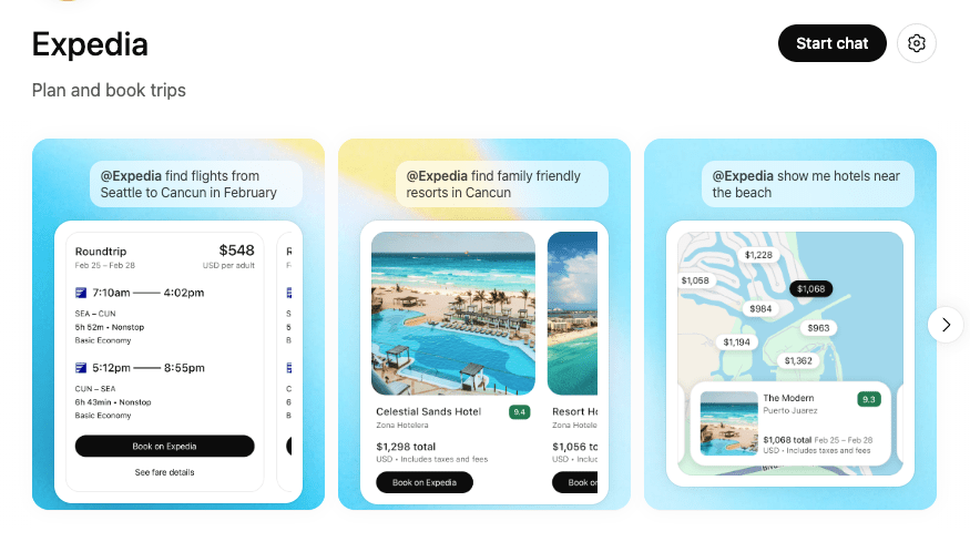 OpenAI ahora permite que desarrolladores externos creen y publiquen sus propias aplicaciones dentro de ChatGPT (el mismo espacio de chat al que Booking.com y Expedia se unieron como primeros socios) para cualquier marca de viajes que apruebe la revisión.