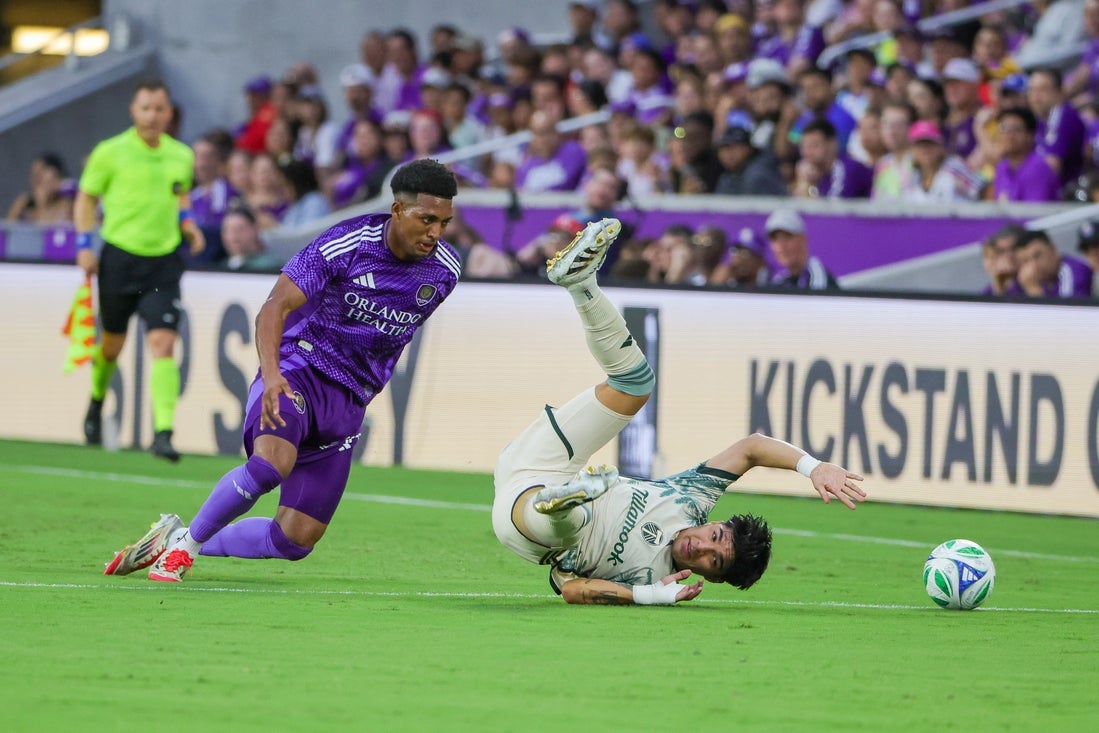 MLS: Portland Timbers en Orlando City24 de mayo de 2025; Orlando, Florida, EE. UU.; El defensor de Portland Timbers, Omir Fernández (22), lucha por el balón contra el defensor de la ciudad de Orlando Alex Freeman (30) durante la primera mitad en el Inter & amp; Co Stadium. Crédito obligatorio: Mike Watters-Imagn Images