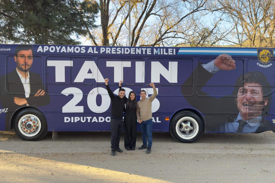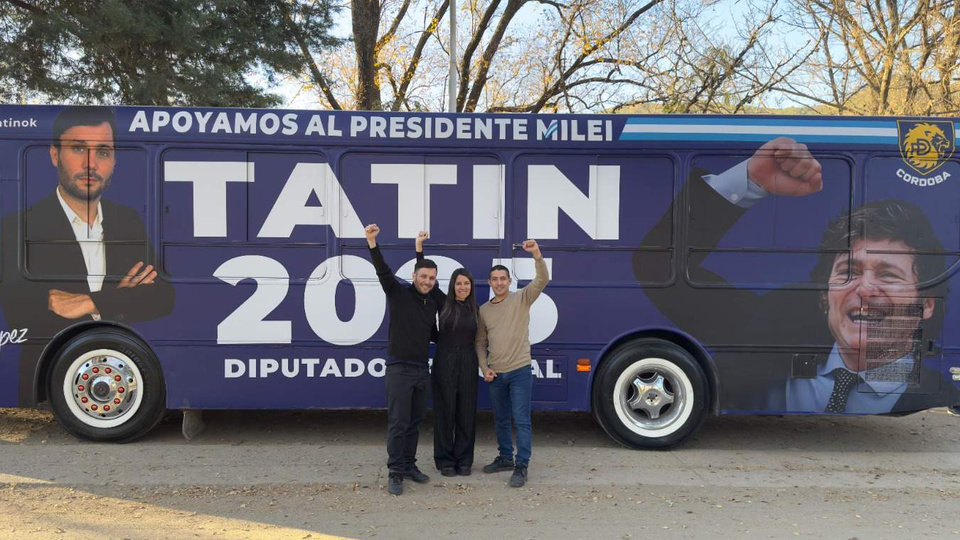 Durante la Derecha Fest de Córdoba, Un Portentoso Colectivo Llamó la Atentión en el Estacionamiento del Hotel Quórum por Su Plattoando: Sobre El Fondo Azul Se Recortaba La Cara del Presidente Javier Milei, Del Influencer Villlarariense Y la Leyenda «Tatin 2025».
