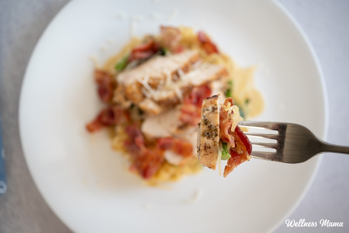 Deliciosa y saludable carbonara de pollo servida sobre espaguetis de calabaza repletos de nutrientes.