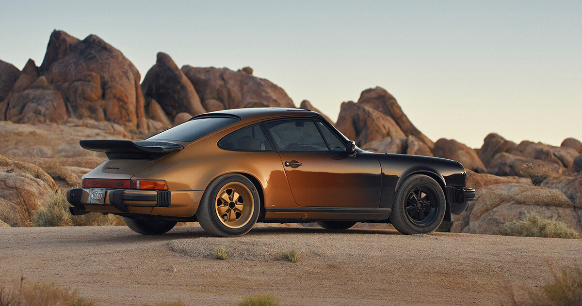 Un 1984 Porsche El 911, propiedad de Nick Londy, con sede en Los Ángeles, se convierte en una ilusión óptica a través de un rediseño dirigido por el fotógrafo automotriz Webb Bland con la ayuda de la diseñadora Sera Trimble. Comenzó como un simple repintado, pero finalmente evolucionó hasta convertirse en un rediseño visual completo. El auto ahora se define por su degradado de negro a dorado, un acabado que parece fundirse con el paisaje desértico donde fue fotografiado.