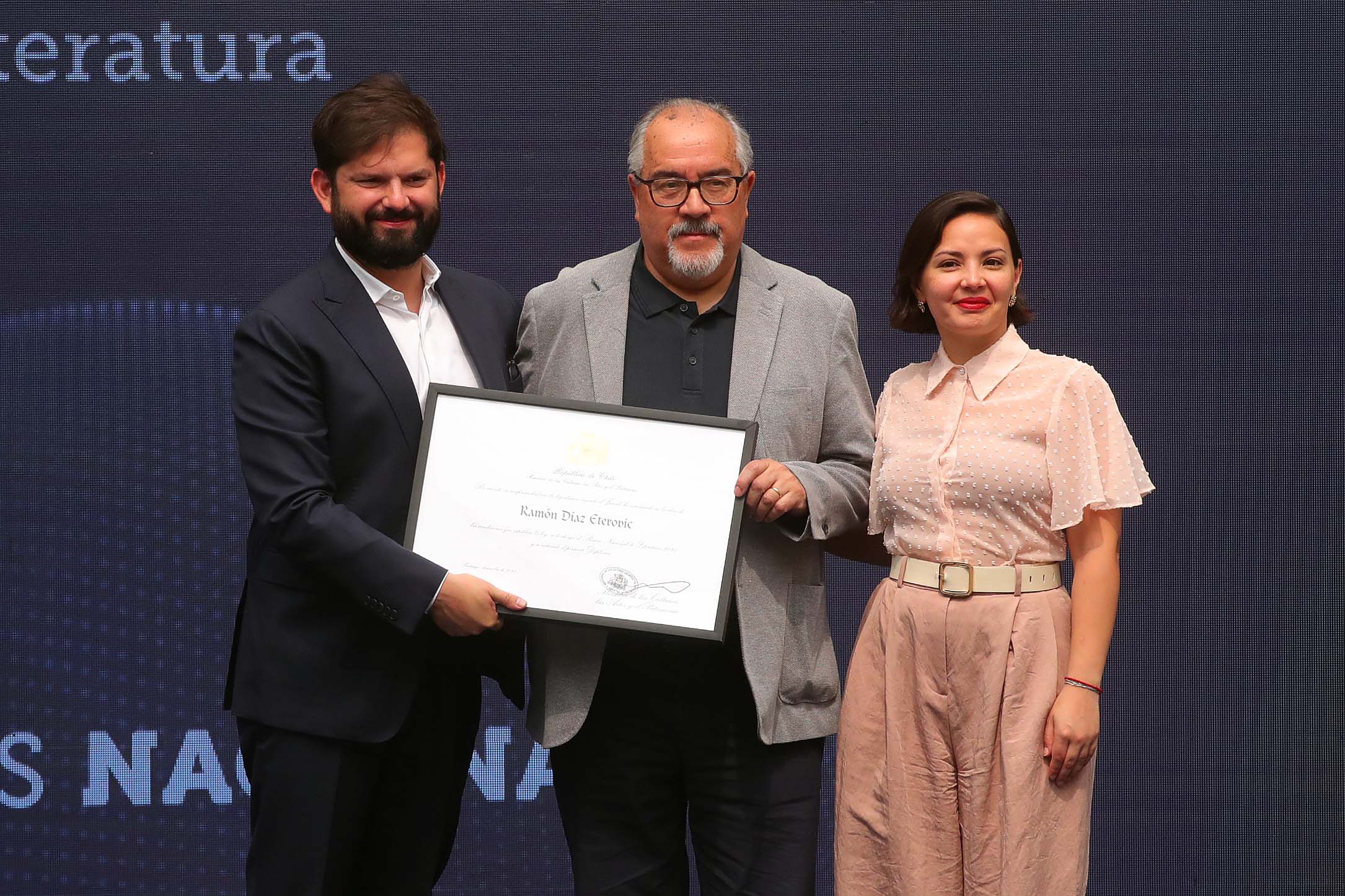 Junto a la ministra de las Culturas, Carolina Arredondo, el mandatario hizo entrega del reconocimiento a Alejandro «Mono» González en Artes Plásticas; Jaime Vadell en Artes de la Representación y Audiovisuales; y Ramón Díaz Eterovic en Literatura.
