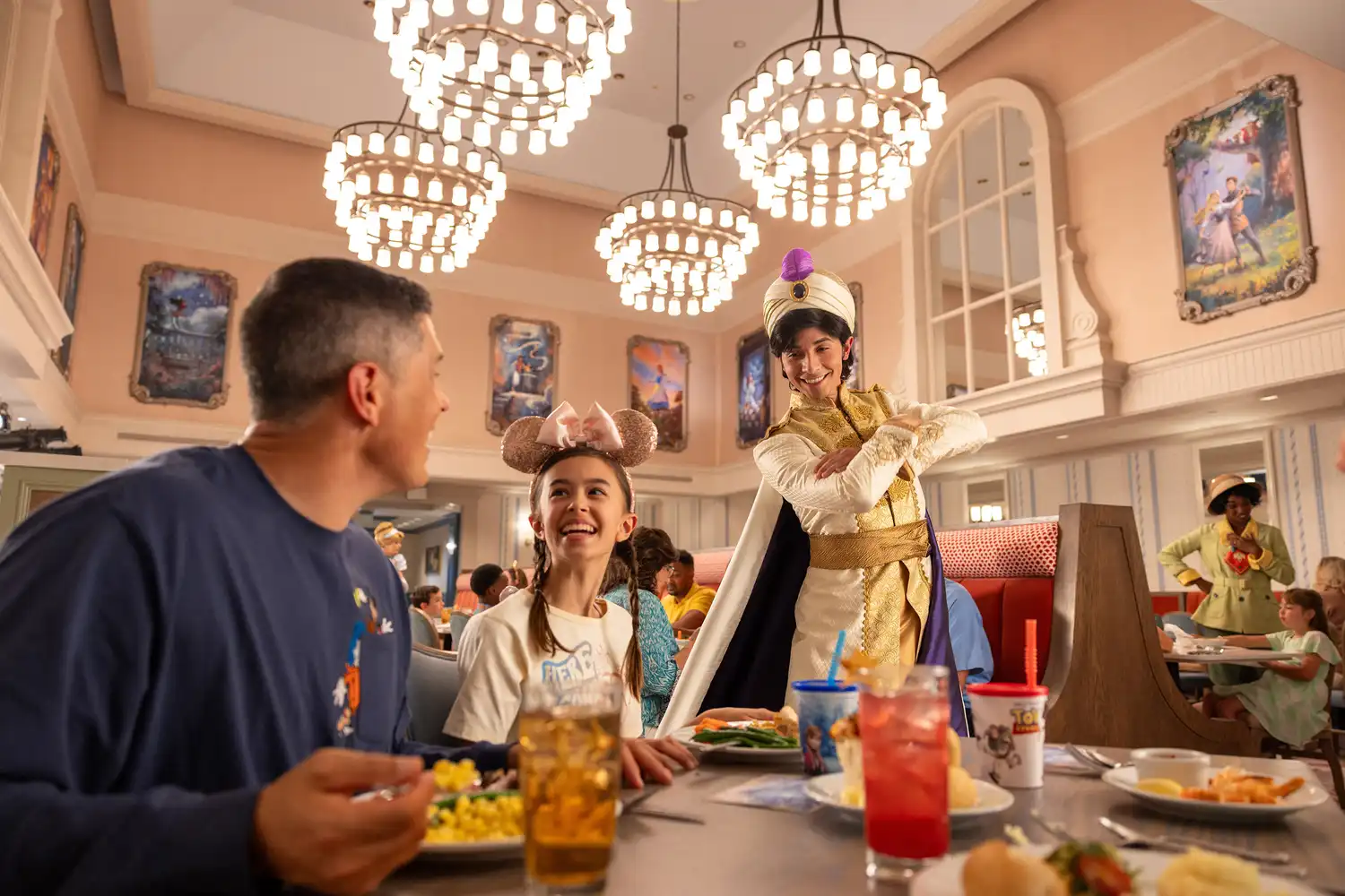En esta renovada experiencia gastronómica con personajes en 1900 Park Fare, te acompañará una nueva realeza: Aladdin con su atuendo de Príncipe Ali, Cenicienta, Mirabel y Tiana con su nuevo disfraz para Tiana's Bayou Adventure, mientras todos celebran el poder de un deseo. .