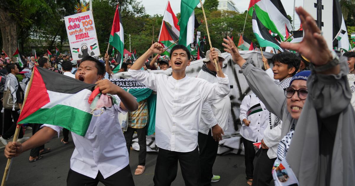 Más de 1,000 manifestantes pro-palestinos marcharon a la embajada de los Estados Unidos en la capital de Indonesia, Yakarta, para denunciar el bloqueo de Gaza de Israel y la detención de activistas de la flotilla global de Sumud que intentó romperse la semana pasada.