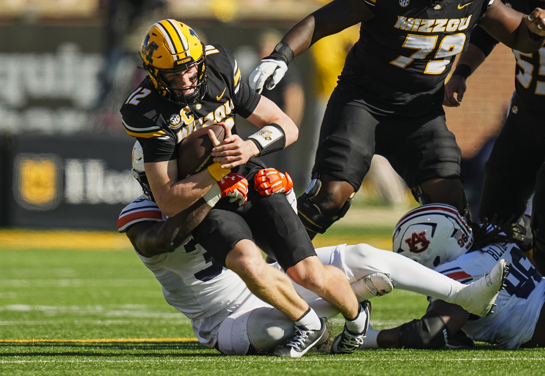 19 de octubre de 2024; Columbia, Misuri, Estados Unidos; El mariscal de campo de Missouri Tigers Brady Cook (12) es abordado por el equipo de nariz de Auburn Tigers Jalen McLeod (35) durante la primera mitad en Faurot Field en el Memorial Stadium. Crédito obligatorio: Jay Biggerstaff-Imagn Images Brady Cook se recuperó de una lesión en el tobillo y lanzó para 194 yardas mientras el No. 19 Missouri se recuperaba para una victoria en casa por 21-17 sobre Auburn el sábado en Columbia, Missouri.