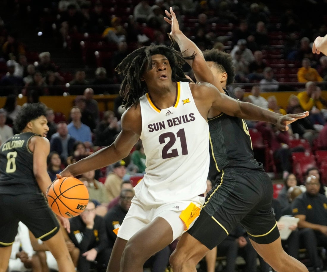Sindicación: República de ArizonaEl delantero del estado de Arizona, Jayden Quaintance (21), se dirige a la guardia de la UCF Keyshawn Hall (4) durante el juego Big 12 en Desert Financial Arena en Tempe el 14 de enero de 2025.