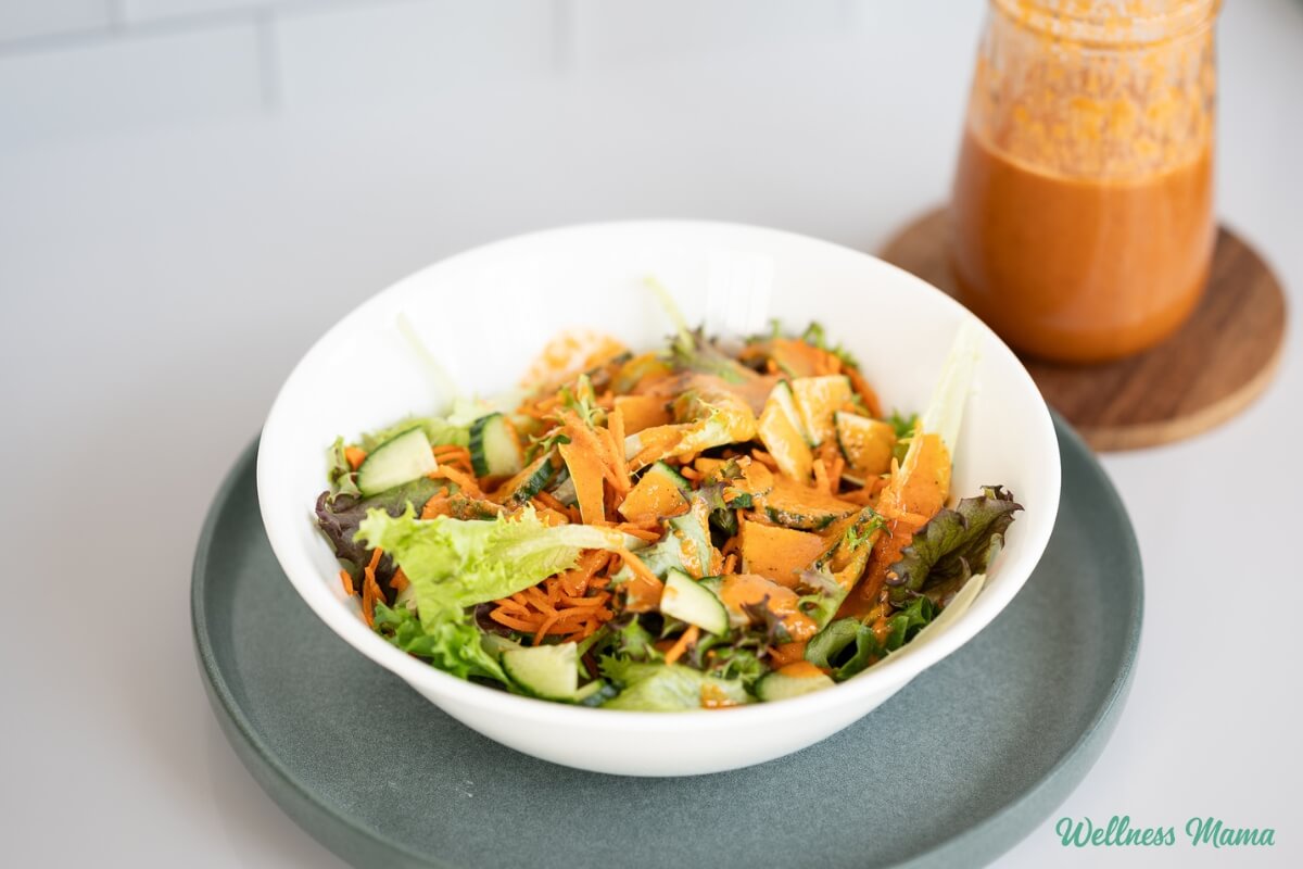 Una de mis cosas favoritas en nuestro restaurante japonés local es su aderezo de jengibre para ensalada (que probablemente tenga ingredientes cuestionables, pero he evitado preguntar). De cualquier manera, mi cuenta bancaria y mi salud tendrían problemas si me dirigiera al restaurante cada vez que tuviera antojo de su comida. Así que he estado experimentando con una versión casera con ingredientes nutritivos y estoy muy contenta con el resultado final.