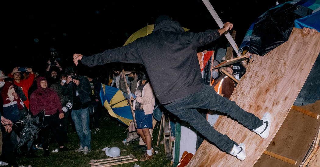 La noche anterior estallaron violentos enfrentamientos cuando un Un grupo de unos 200 contramanifestantes irrumpió en el campamento.t, rociando pimienta a los manifestantes y tratando de demoler barricadas. Los dos grupos lucharon hasta que los agentes calmaron los disturbios alrededor de las 3:30 de la mañana.