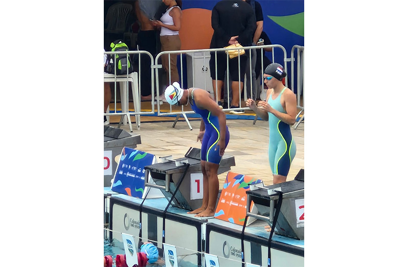 Ella está acompañada por el entrenador Christol Thom y el presidente de la Asociación de Natación Amateur de Guyana (GASA) Yolema Phillips.