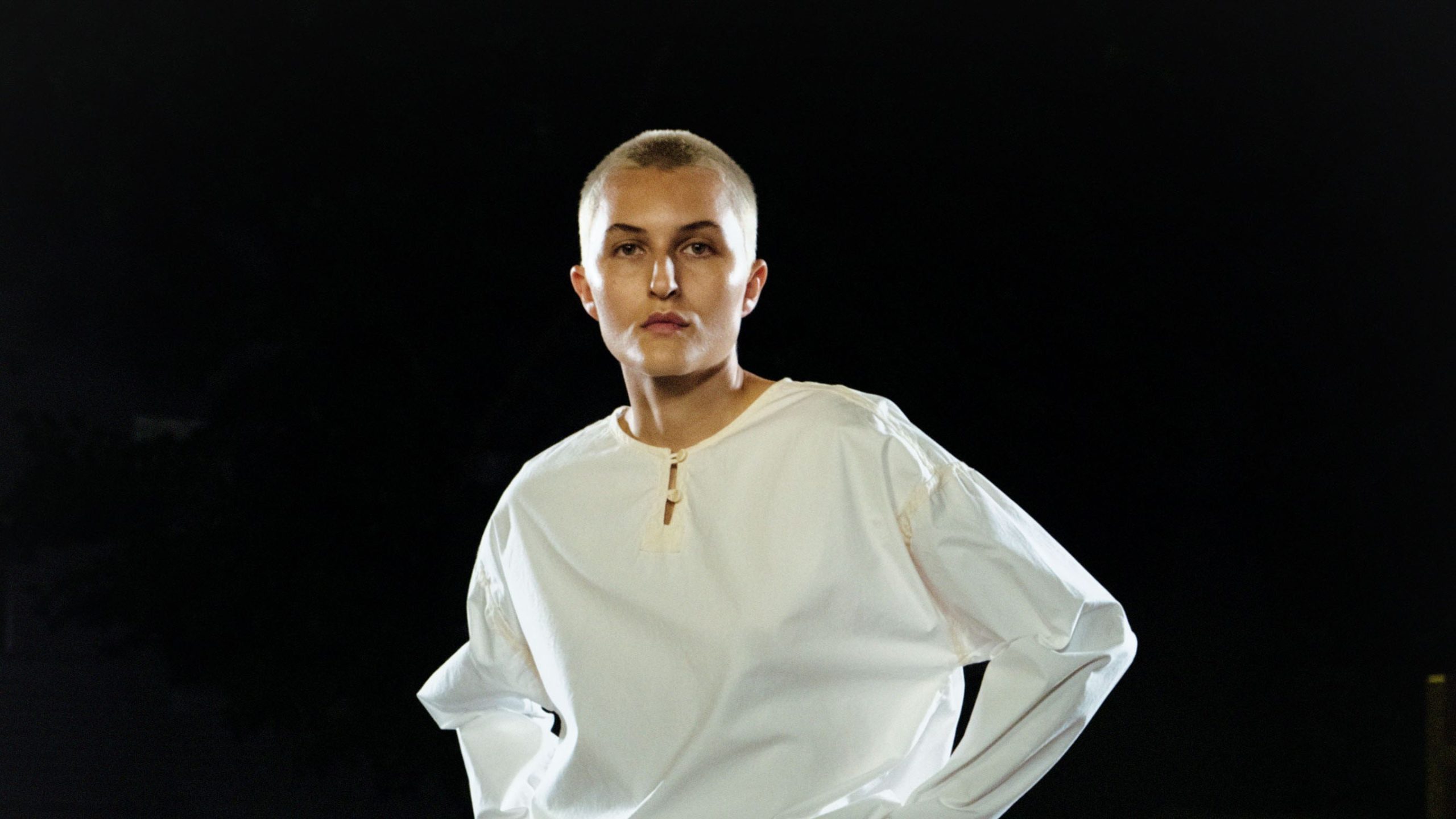 Abrir el espectáculo como una luna llena fue una sorpresa: una camisa de manga larga relativamente simple y completamente blanca y de manga larga y una falda escalonada; Esto de los diseñadores que se deleitan en color, selección de seda y collage. «Estábamos pensando en superficies en blanco como paños, velas y pancartas», explicaron los diseñadores. «Todos estos son materiales funcionales con costuras y hardware simples pero potentes como los arandelas, a menudo atados con cuerda». El espectáculo continuó con un set de banda blanca en una malla deportiva negra, una túnica con cordones y ardillas, y una falda de mezclilla asimétrica y una tapa a juego atada. Había rayas, tanto delgadas como anchas, y su estriación se imitaba en dos looks triturados/Fringey.