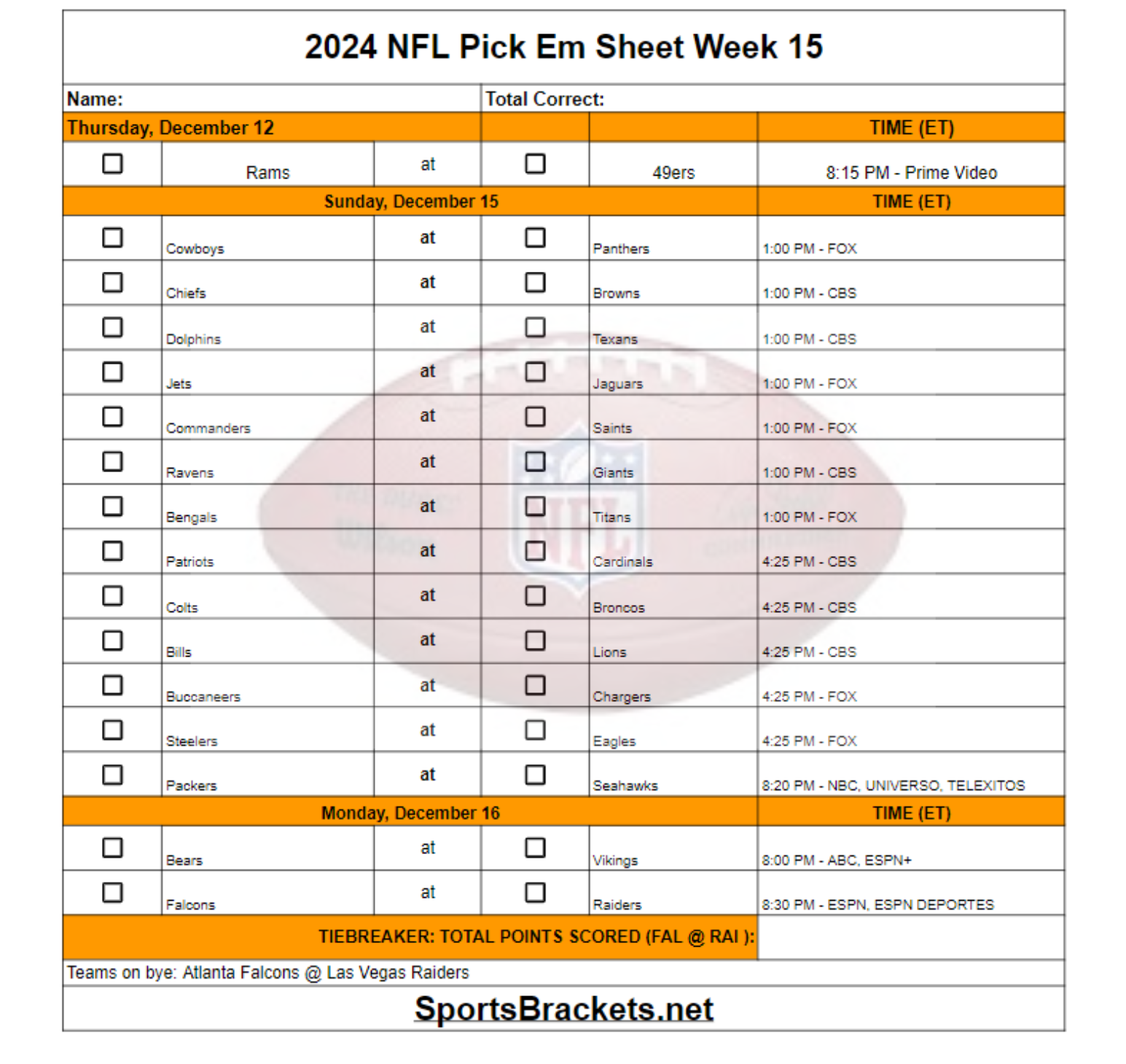 Descargar su hoja Pick Em de la NFL 2024 para Semana 15 y compártelo con amigos para realizar un seguimiento de las selecciones durante la semana. ¡Asegúrate de enviar todas las selecciones antes del enfrentamiento del jueves por la noche! Todos los horarios enumerados están en hora del este de EE. UU. y las cadenas de televisión están incluidas para que pueda seguir la acción. ¡Siga sus predicciones y vea quién gana al final de la semana!