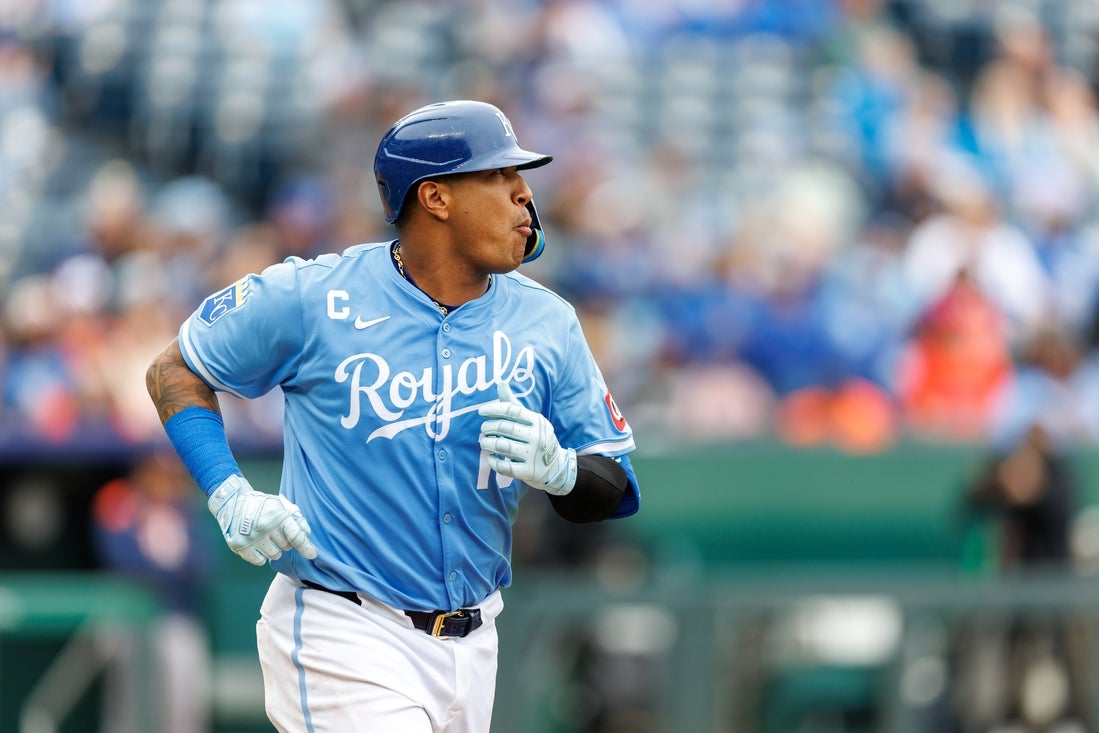 27 de abril de 2025; Kansas City, Missouri, EE. UU.; El receptor de los Reales de Kansas City, Salvador Pérez (13) se extiende a la primera base después de un golpe durante la sexta entrada contra los Astros de Houston en el estadio Kauffman. Crédito obligatorio: Imágenes de William Purnell-Imagn El equipo que puede generar una ofensiva, cualquier ofensiva, podría estar en la mejor forma cuando los Reales de Kansas City y los anfitriones de los Orioles de Baltimore se encuentran en el juego de caucho de su serie de tres juegos el domingo por la tarde.