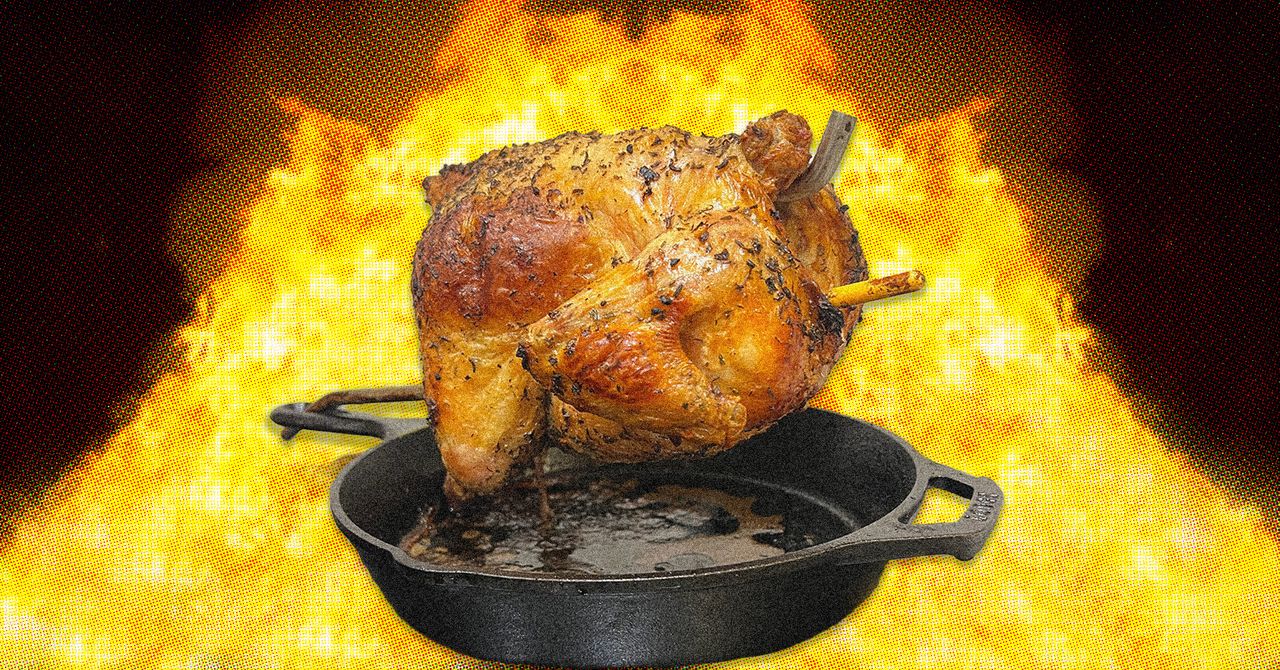 Chef Chris Young de la cocina modernista y CombustiónUn mejor termómetro inalámbrico que el RFX, en mi opinión, también intervino. Parecía apreciar cómo el Poultree aleja al pájaro de la superficie de cocción, una categoría que junto con los pollos asados a los que se refiere como «pájaros levitantes», que permite que todo el asunto se ponga uniformemente oscuro en el exterior. Poner las verduras en la sartén, crea vapor cerca de la parte inferior del pollo, y esa parte de la piel no se volverá tan agradable y crujiente como el resto del pollo.