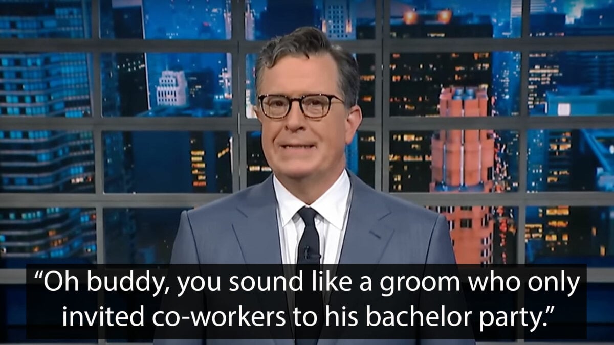 «Ay, amigo, pareces un novio que invitó sólo a sus compañeros de trabajo a su despedida de soltero», dice Colbert, imitando a Vance. «Los quiero, chicos, gracias por venir a la casa de mi madre. Oye, ¿deberíamos volvernos un poco locos y pedir otra ronda de Mountain Dew dietético? Si los demócratas nos dejan, ¿no es así? ¿Adónde van todos? Sólo tú y yo otra vez, mamá».