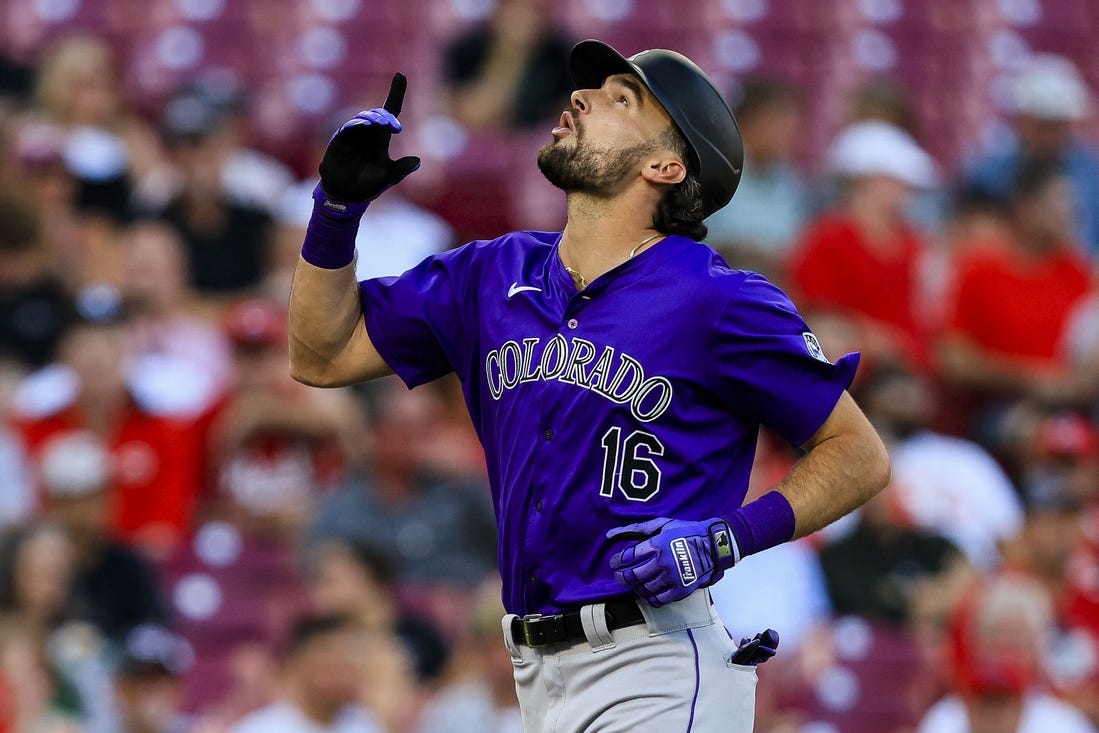 MLB: Colorado Rockies contra Cincinnati Reds10 de julio de 2024; Cincinnati, Ohio, EE. UU.; El jardinero de los Colorado Rockies, Sam Hilliard (16), reacciona después de conectar un jonrón de dos carreras en la tercera entrada contra los Cincinnati Reds en el Great American Ball Park. Crédito obligatorio: Katie Stratman-USA TODAY Sports