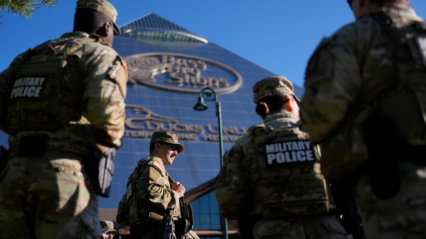 Miembros de la Guardia Nacional patrullan afuera de Bass Pro Shops el 10 de octubre en Memphis, Tennessee.