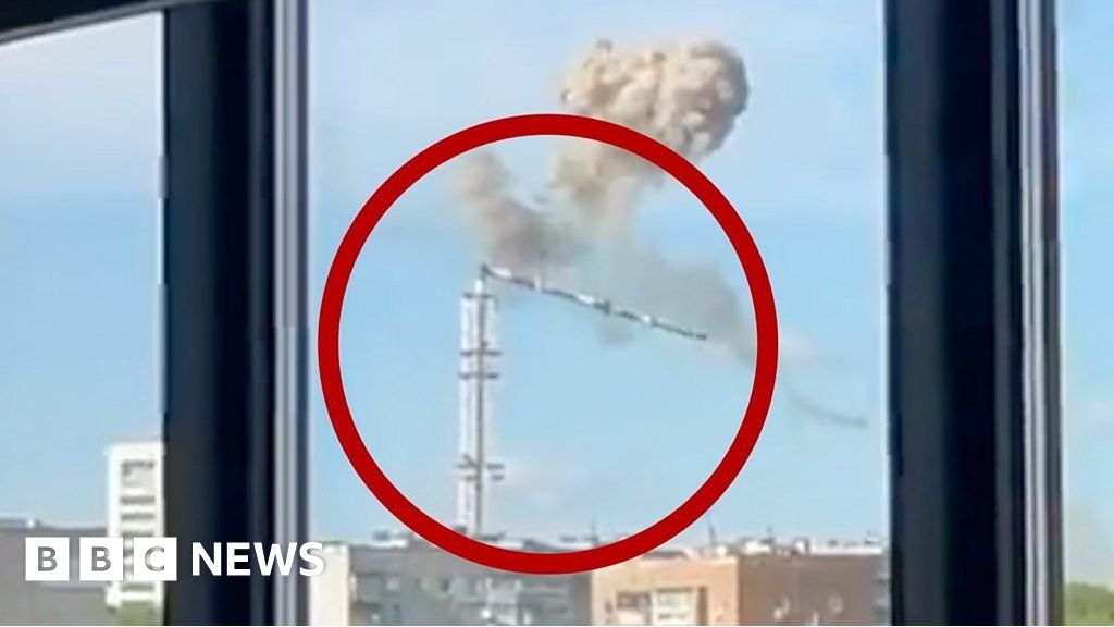 Las imágenes muestran el momento en que una importante torre de televisión se partió por la mitad y cayó al suelo en la ciudad ucraniana de Kharkiv.