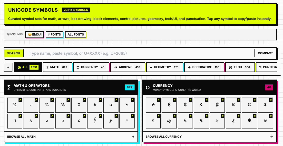 Finalmente, tiene el siempre útil. selector de símbolos Unicodeque los agrupa por matemáticas, flechas, decorativos, divisas, geometría… Nuevamente cuestión de copiar y pegar. Hay 2.931 de estos.