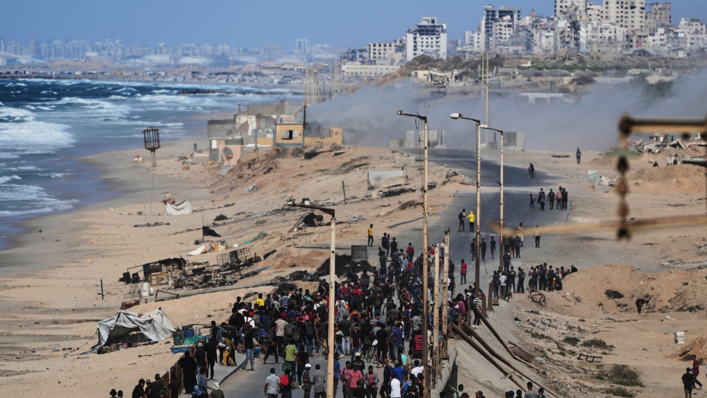 Palestinos desplazados se reúnen en la carretera costera cerca de Wadi Gaza después del anuncio de que Israel y Hamás habían acordado la primera fase de un plan de paz para detener los combates, mientras los tanques israelíes bloquean la carretera que conduce a la ciudad de Gaza, en el centro de la Franja de Gaza, el jueves 9 de octubre de 2025.