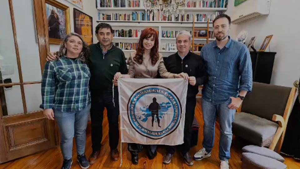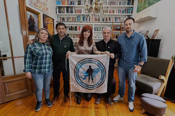 Los excombatientes También le Regalaron a la expresida una remera con un dibujo del archipiélago y las palabras «Memoria, Verdad, Justicia, Soberanía, Paz».