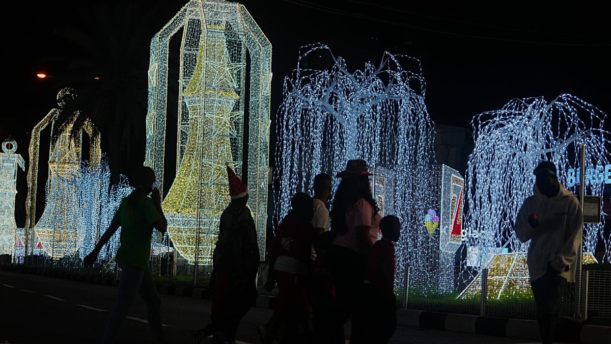 Familiares y amigos posaron para fotografías y vídeos cortos a lo largo de calles decoradas, cerca de árboles iluminados, figuras de renos y túneles de luz. Las escenas parecían relajadas, incluso alegres, a pesar de las preocupaciones constantes sobre la inseguridad y el aumento del costo de vida en todo el país.