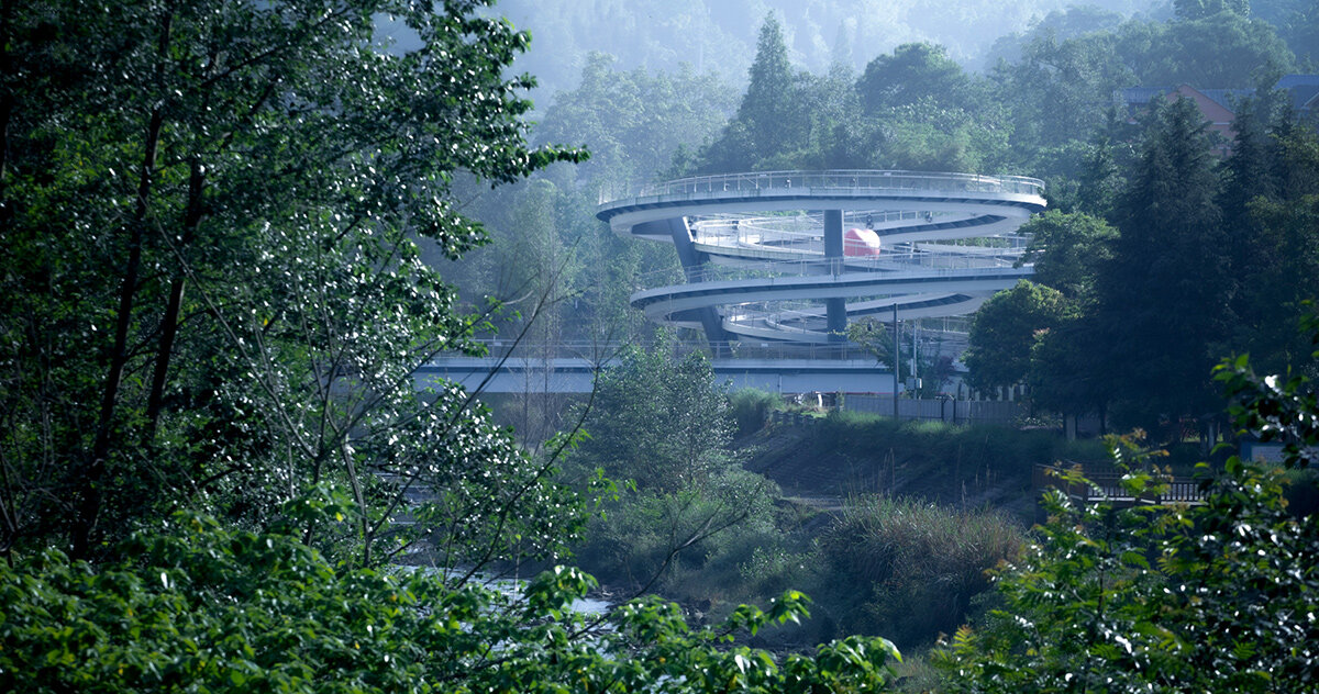Estas espirales unen dos plataformas de puente suavemente sinuosas, produciendo una secuencia de circulación con varias opciones de ruta. El movimiento a través del puente G Clef se convierte en una progresión constante de perspectivas cambiantes: hacia los tejados de influencia francesa de Bailu Town, hacia los planos metálicos afilados del Diamond Music Hall y hacia el lecho del río a medida que atraviesa el valle.